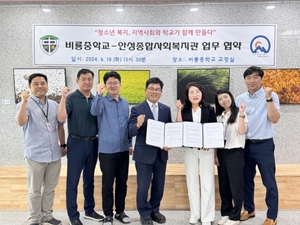 [경기/스타트뉴스TV=홍성규 기자] 안성종합사회복지관은 6월 18일 비룡중학교와 업무협약을 체결했다. 이번 업무협약은 양 기관이 협력관계를 바탕으로 체계적이고 통합적인 안전망을 구축해 청소년의 복지증진과 관련된 공익목적 사업을 활성화하고 이와 관련된 상호 교류 및 협력 사업을 추진하고자 체결됐다. 이형석 교장은 “청소년의 복지 수준을 향상시키고 청소년의 권익을 보호하기 위해 공동으로 노력해 안전하게 학업 생활을 할 수 있도록 양 기관이 함께 학교와 가정과 지역사회가 청소년을 돌보는 안전한 사회가 되길 바란다”고 전했다. 장은순 관장