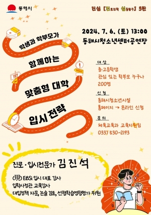 [강원/스타트뉴스TV=김대형 기자] 동해시가 진로진학에 진심 프로젝트 진심 3탄으로 진로·입시 관련 분야 전문가를 초청, 맞춤형 대학 입시 전략 특강을 개최한다고 밝혔다. 이에 따라, 다음달 6일 오후 1시 청소년센터에서 열리는 이번 특강은 前 교육부 학교생활기록부 현장 실무지원단 위원, 한국대학교육협의회 대입상담교사 등을 역임했고 현재 EBSi 입시 대표 강사이자, 입시 관련 분야 전문가인 김진석 강사가 학생들의 성공적인 대학 진학을 위한 맞춤형 입시 전략을 강의한다. 이날 김진석 강사가 오랜 입시 컨설팅 경험을 바탕으로 한 실질