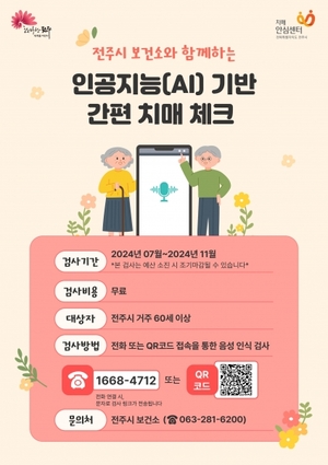[전북/스타트뉴스TV=이창환 기자] 전주시민들은 앞으로 보건소를 방문하지 않아도 스마트폰을 이용하면 3분 만에 치매 위험도를 확인할 수 있다. 전주시보건소는 치매 고위험군을 조기에 발견하고 관리하기 위해 오는 7월부터 ‘AI 간편 치매 체크’ 서비스를 제공할 계획이라고 20일 밝혔다. AI 간편 치매 체크 서비스는 인공지능 기술을 이용한 검사로 시는 지난 5월 과학기술정보통신부와 정보통신산업진흥원이 주관한 ‘AI 바우처 지원사업’에 최종 선정돼 국비를 지원 받아 이 서비스를 제공할 수 있게 됐다. 해당 서비스는 60세 이상 전주시민