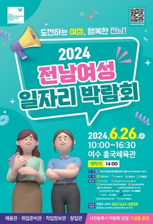 [전남/스타트뉴스TV=이정아 기자] ‘전남 여성 일자리 박람회’가 오는 26일 ‘도전하는 여성, 행복한 전남’이라는 슬로건 아래 여수 흥국체육관에서 열린다. 전라남도와 여수시가 주최하고 여수여성인력개발센터가 주관하는 이번 박람회는 새로운 시작을 희망하는 지역 여성들에게 일자리를 연계하고 취업과 창업 정보를 제공한다. 현장채용업체와 간접채용업체 150개가 참여해 구직을 희망하는 여수·광양·구례 지역 여성들과 만남의 장으로 실질적 일자리 제공은 물론 구인기업에게도 인재채용의 기회 현장에서는 채용관, 취업준비관, 직업정보관, 창업관 등