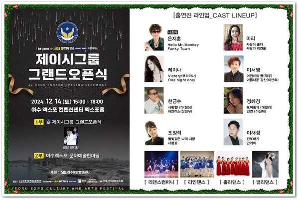 [여수/스타트뉴스=양해석기자]여수광양항만공사(사장:박성현)가 주최 하고 전국TV채널838번 START tv와 함께하며,사단법인 한국음악예술총연합회 주관하는 '여수엑스포 문화예술한마당' 이△여수문화원△광양문화원△순천문화원△제이시그룹 △ 한국문화예술아카데미△메타교육원△마블라이프 협동조합 협찬과 후원으로 대 예술축제가 화려하게 열린다.여수광양 항만공사가 주최 하고,한국음악예술총연합회가 주관하는 이번 행사는 여수엑스포홀에서14일15시부터~20시40분까지 실시하고, 이어 이창휘 콘서트가 자리를 옮겨 대교로 94 돌산대교 앞 산수몽에서 마무리