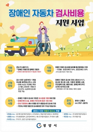 [전남/스타트뉴스TV=민송이 기자] 전라남도 광양시가 장애인에 대한 자동차 정기·종합 검사비를 지원한다.이는 ‘전라남도 장애인 자동차 검사비 지원 조례안’ 제정에 따른 것으로 기존에 여수나 순천 등 인근 지역의 교통안전공단 검사소에 가야만 감면 혜택을 받을 수 있었던 교통약자의 이동 불편 및 경제적 부담을 덜기 위해 지원 사업을 시행한다고 밝혔다. 지원 대상은 장애인 사용 자동차 표지를 발급받은 비사업용차량이며. 감면율은 △심한 장애 50% △심하지 않은 장애 30%이다.또한 정기·종합 검사일 현재 광양시에 자동차 사용본거지를 두고