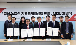 [내포=스타트뉴스 이찰휘 기자] 충남도는 19일 도청에서 농업정책보험금융원, 충남테크노파크, 충남경제진흥원과 ‘충남 농축산 지역경제 활성화 펀드’ 업무협약(MOU)을 체결했다.이번 협약은 도내 농축산식품 기업 발굴·투자를 통해 농축산 분야 벤처 창업의 혁신 성장 체계를 구축하고자 마련했다.전형식 정무부지사와 서해동 농업정책보험금융원장, 서규석 충남테크노파크 원장, 한권희 충남경제진흥원장, 운용사인 류준걸 와프인베트먼트 대표이사, 임성원 노틸러스인베스트먼트 대표이사 등 관계자 20여 명이 참석한 가운데, 이번 행사는 경과 보고, 협약