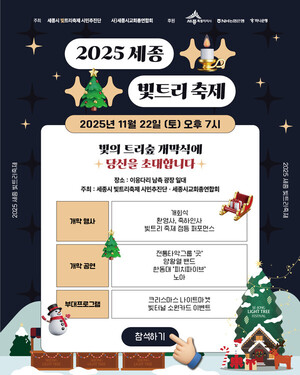 [세종=스타트뉴스 이철휘 기자] 올해로 세번째를 맞는 세종시 겨울철 빛의 향연이 22일 오후 7시에 대단원의 개막을 알린다.이번 세종시 빛트리축제는 시민추진단과 세종시교회총연합회가 공동 주최로 진행되며 대표적인 시민 참여형 겨울축제로 진행될 예정이다.내달 31일까지 40일간 진행될 이번 빛트리축제는 시민들이 직접 꾸민 30여개의 트리가 이응다리 남측 광장에 전시되며, 세종시교회총연합회 트리, 기관 및 기업들이 참여해 그야말로 민⦁관⦁교계가 삼위일체 되는 축제로 이어질 전망이다.개막식 행사에서는 전통타악그룹 ‘굿’의 사전공연을 시작으