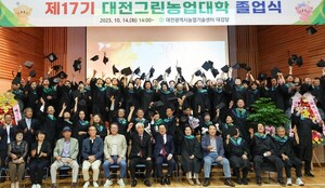 [대전=스타트뉴스 이철휘 기자] 대전시농업기술센터(소장 이효숙)는 14일 농업기술센터 대강당에서 제17기 대전그린농업대학 졸업식을 진행했다.이번 졸업식은 지난해 4월 1일 입학한 69명의 교육생이 졸업장을 수여 받았다. 대전그린농업대학은 지금까지 총 1,317명의 전문 농업인을 배출하며 첨단 과학농업을 선도하는 지역 농업인 교육의 중심 기관으로 자리매김하고 있다.제17기 대전그린농업대학은 전원생활반, 스마트농업반으로 나누어 24회 과정 동안 매주 화요일 4시간씩 운영되었다. 교육 내용은 채소, 과수, 화훼, 특용작물, 토양관리, 병