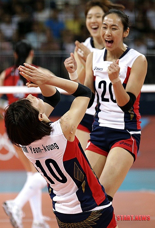 | ▲ 9일(현지시각) 오후 영국 런던 얼스코트에서 열린 2012 런던올림픽 여자 배구 준결승 한국과 미국의 경기에서 한국 선수들이 공격에 성공한 후 환호하고 있다. | ||