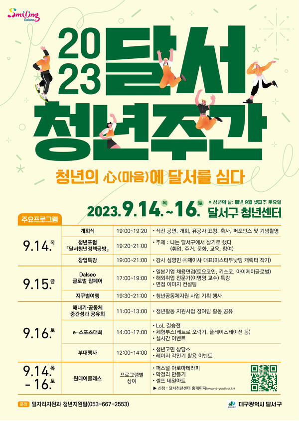 대구 달서구는 9월 14일부터 9월 16일까지 3일간 달서구 청년센터에서 법정기념일인 청년의 날을 기념해 「2023년 달서청년주간」행사를 개최한다고 밝혔다..