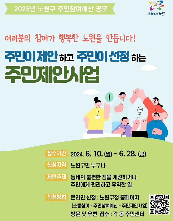 노원구민, 노원구 소재 직장인 및 학생 등이면 누구나 참여할 수 있으며 6월 10일부터 6월 28일까지 노원구청 홈페이지에서 ‘주민제안사업 작성 양식’을 내려받아 온라인으로 제출하면 된다.