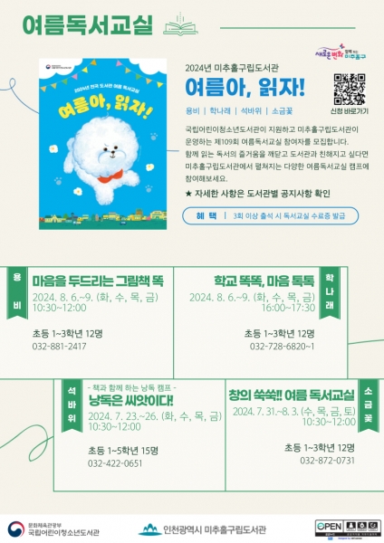 국립어린이청소년도서관이 지원하고 미추홀구립도서관이 운영하는 제109회 여름 독서 교실은 함께 읽는 즐거움을 깨닫고 도서관과 친해질 수 있도록 관내 초등생을 대상으로 용비, 학나래, 석바위, 소금꽃도서관에서 진행된다.