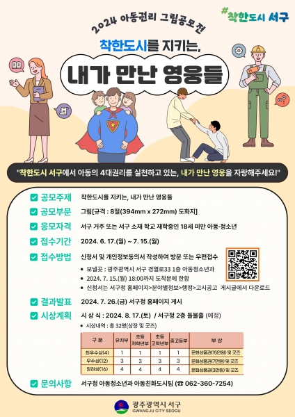 이번 공모전은 ‘착한도시 서구에서 아동의 4대 권리를 실천하고 있는, 내가 만난 영웅의 모습’이라는 주제로 △유치부 △초등저학년부 △초등고학년부 △중·고등부로 나눠 진행된다.