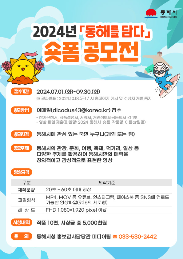 이에 따라, 시는 2024 ‘동해를 담다’ 숏폼 공모전을 개최, 동해시를 배경으로 생생한 감동과 에피소드가 담긴 숏폼 컨텐츠를 발굴, 이를 시 이미지 홍보에 적극 활용하겠다는 방침이다.