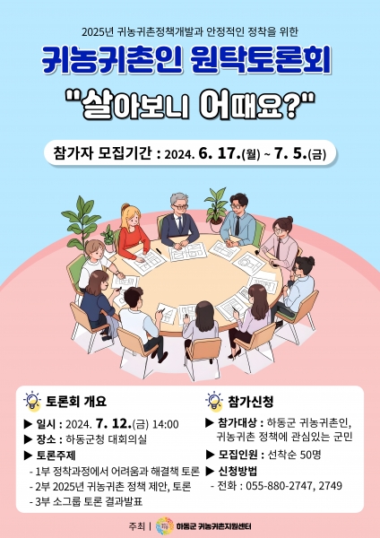 이번 토론회는 모집된 귀농·귀촌인과 함께 하동군청 대회의실에서 오후 2시부터 진행될 예정이며 군은 토론 결과를 2025 귀농·귀촌 사업에 반영할 계획이라고 밝혔다.