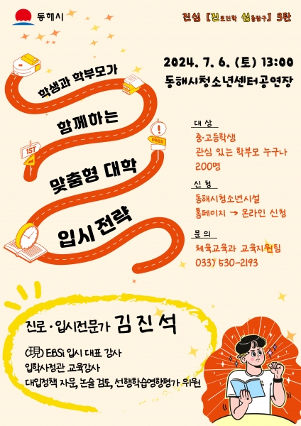 이에 따라, 다음달 6일 오후 1시 청소년센터에서 열리는 이번 특강은 前 교육부 학교생활기록부 현장 실무지원단 위원, 한국대학교육협의회 대입상담교사 등을 역임했고 현재 EBSi 입시 대표 강사이자, 입시 관련 분야 전문가인 김진석 강사가 학생들의 성공적인 대학 진학을 위한 맞춤형 입시 전략을 강의한다.